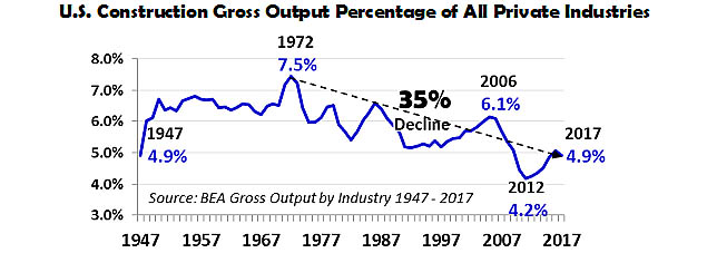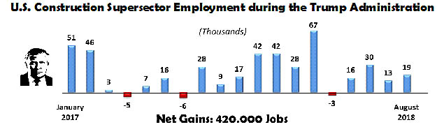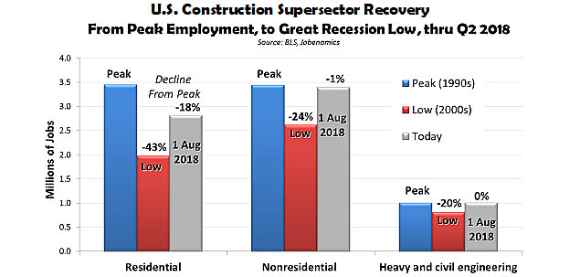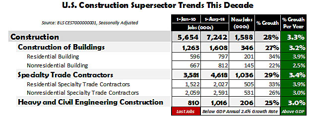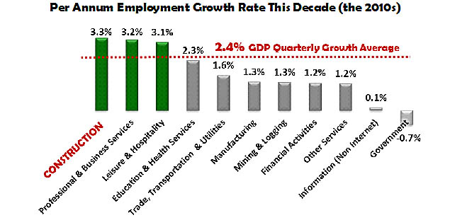 To say the American construction industry is booming is an understatement. So far this decade, the U.S. Construction supersector’s 3.3% annual employment growth is the fastest growing supersector of all ten industry supersectors. Moreover, each of this supersector’s sectors and subsectors (Construction of Buildings, Specialty Trade Contractors, and Heavy and Civil Engineering Construction) exceeded the annual rate of U.S. GDP growth by substantial margins—the only supersector to do so. Construction industry’s wages for production and nonsupervisory workers are now the fourth highest in the ten supersectors. Employment in Heavy and Civil Engineering is at an all-time high and has a bright future considering a plethora of potential national infrastructure projects. Nonresidential construction is approaching peak employment and is likely to grow as more and more investors commit their financial resources to new commercial enterprises. While residential construction is still 18% below peak employment, new home starts and sales doubled in number from their post-recession lows.